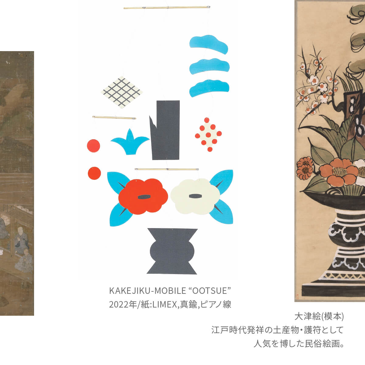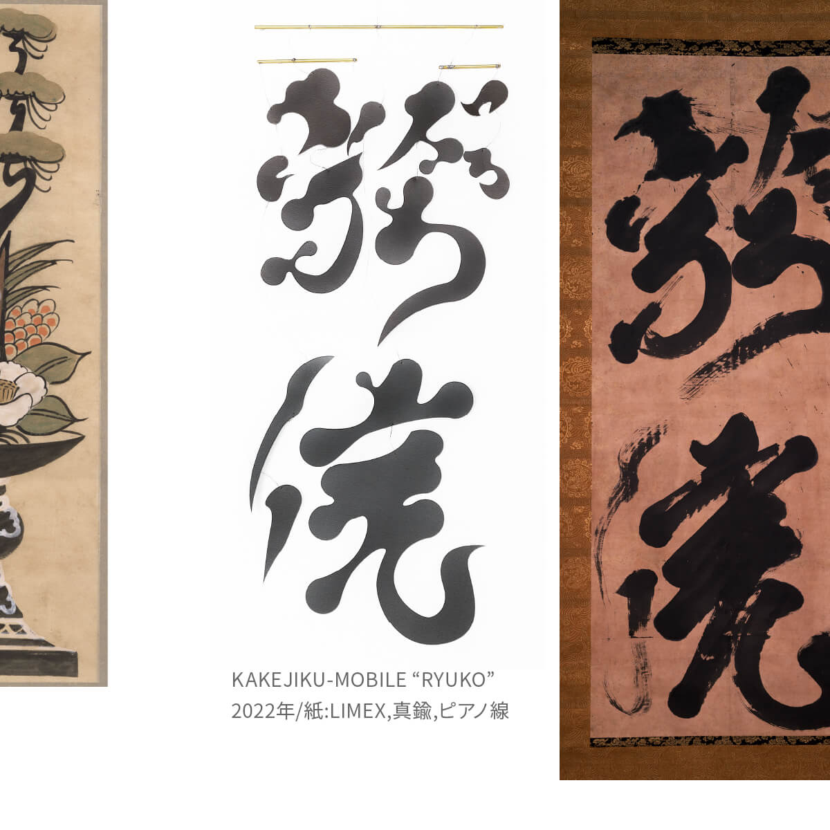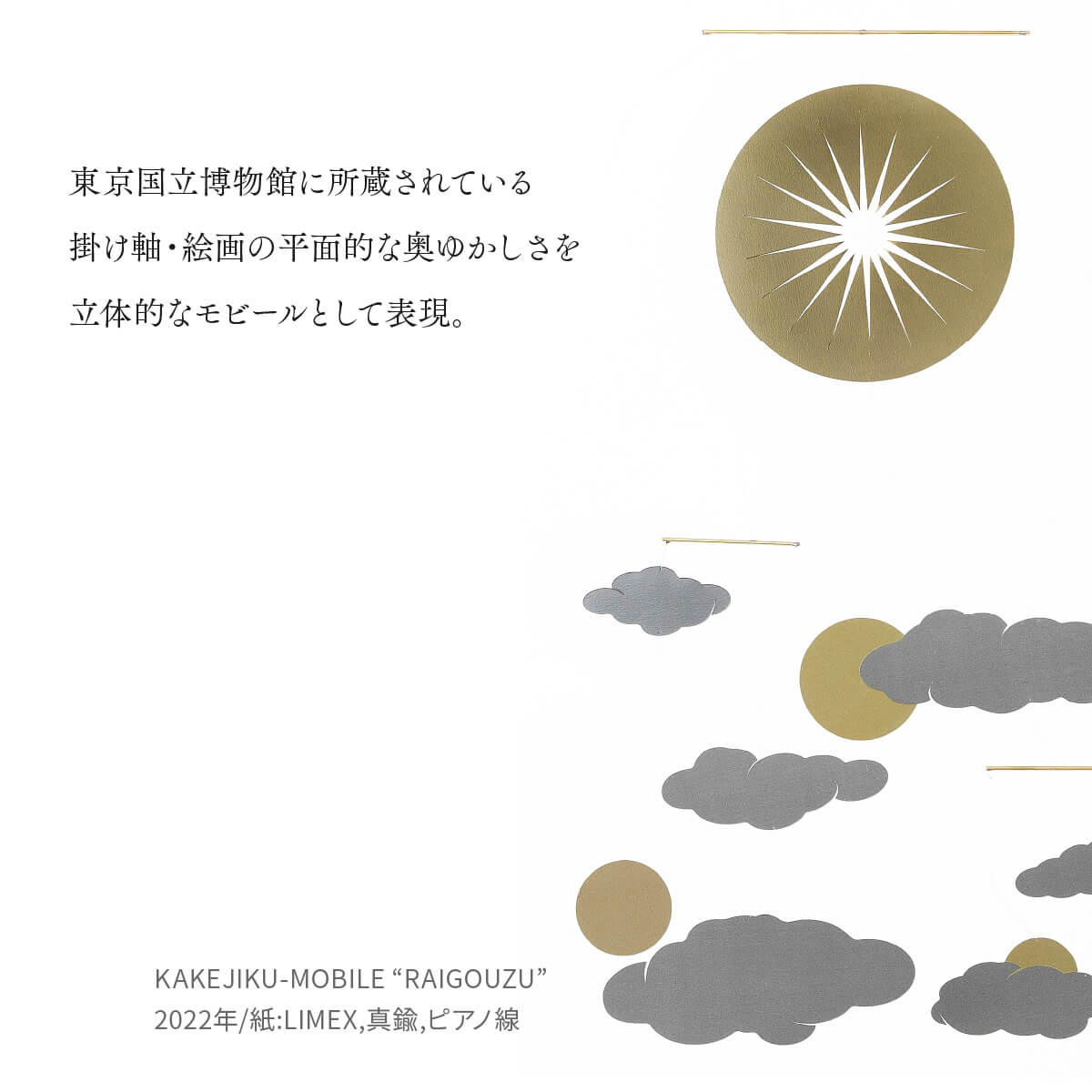 東京国立博物館に所蔵されている、掛けた状態での鑑賞を目的とされた美術品をモチーフに、モビールとして立体的に表現しました。 気軽に掛けて鑑賞できるあたらしい掛け軸をお楽しみください。 Collection 東京国立博物館 Inspired by: ・阿弥陀聖衆来迎図(鎌倉時代) ・大津絵(明治時代) ・龍虎ニ大字(桃山時代)