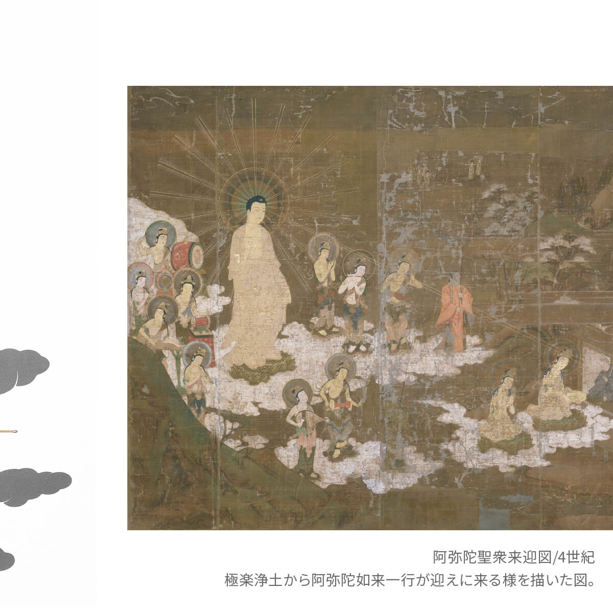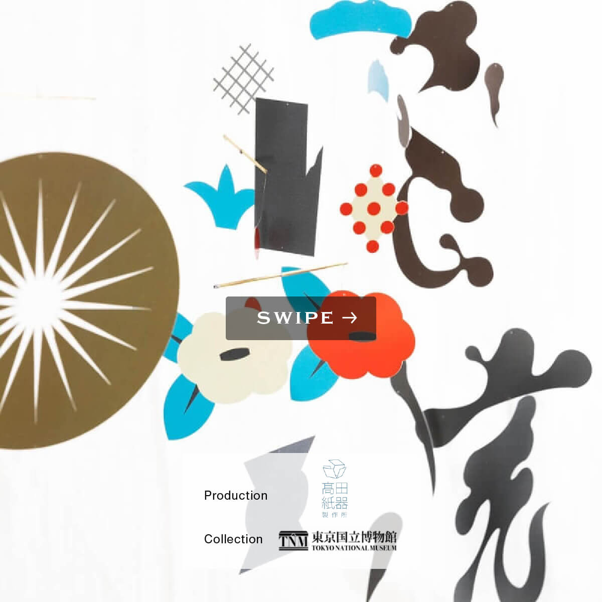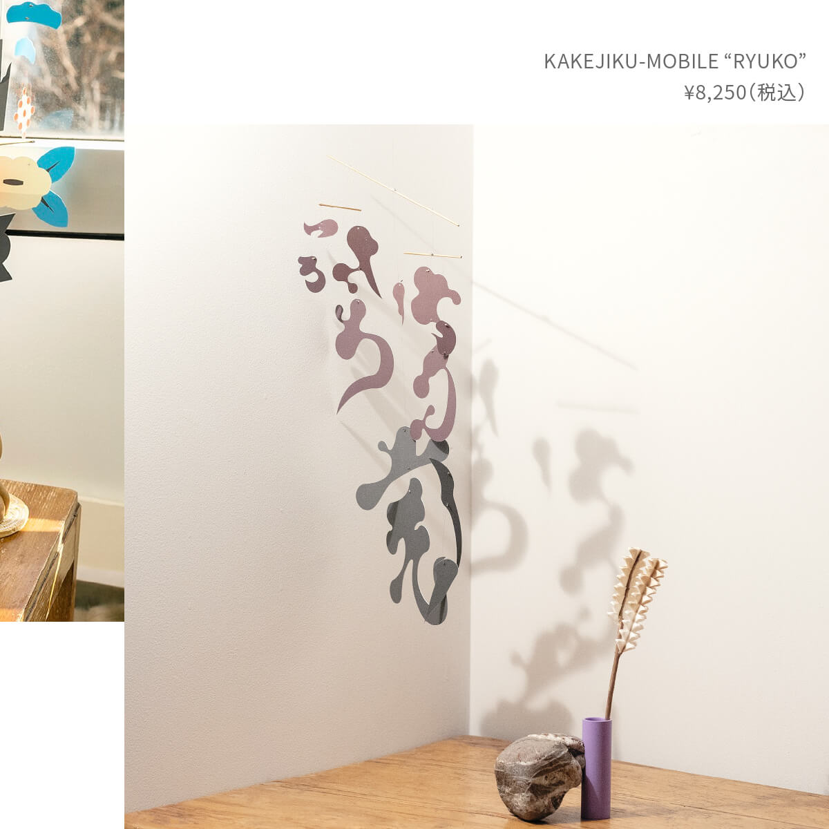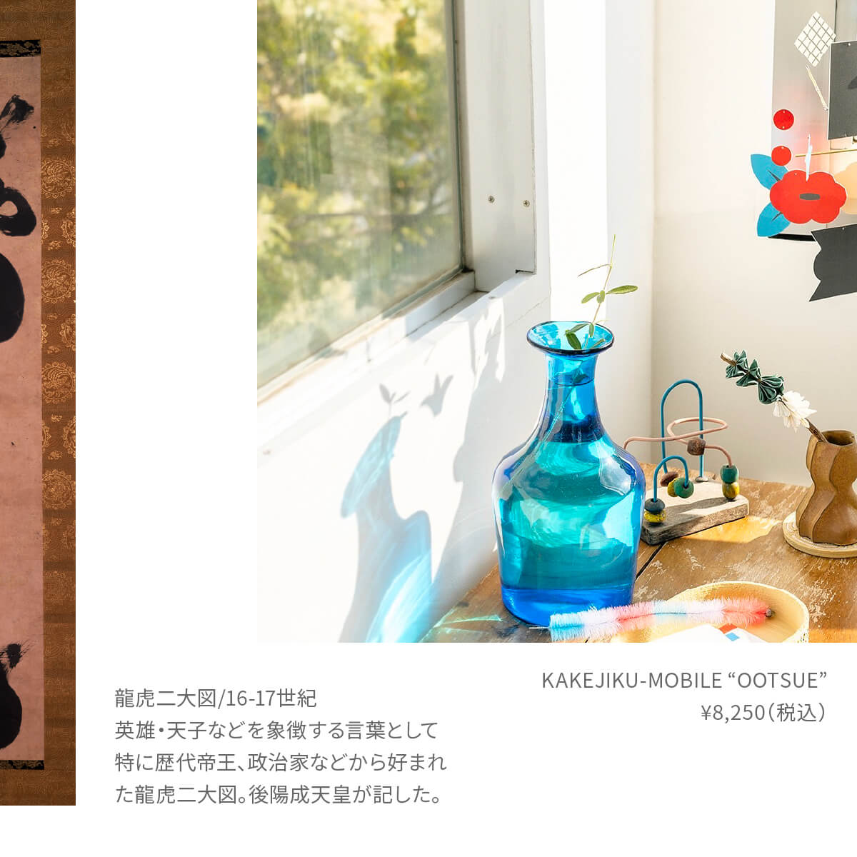 東京国立博物館に所蔵されている、掛けた状態での鑑賞を目的とされた美術品をモチーフに、モビールとして立体的に表現しました。 気軽に掛けて鑑賞できるあたらしい掛け軸をお楽しみください。 Collection 東京国立博物館 Inspired by: ・阿弥陀聖衆来迎図(鎌倉時代) ・大津絵(明治時代) ・龍虎ニ大字(桃山時代)