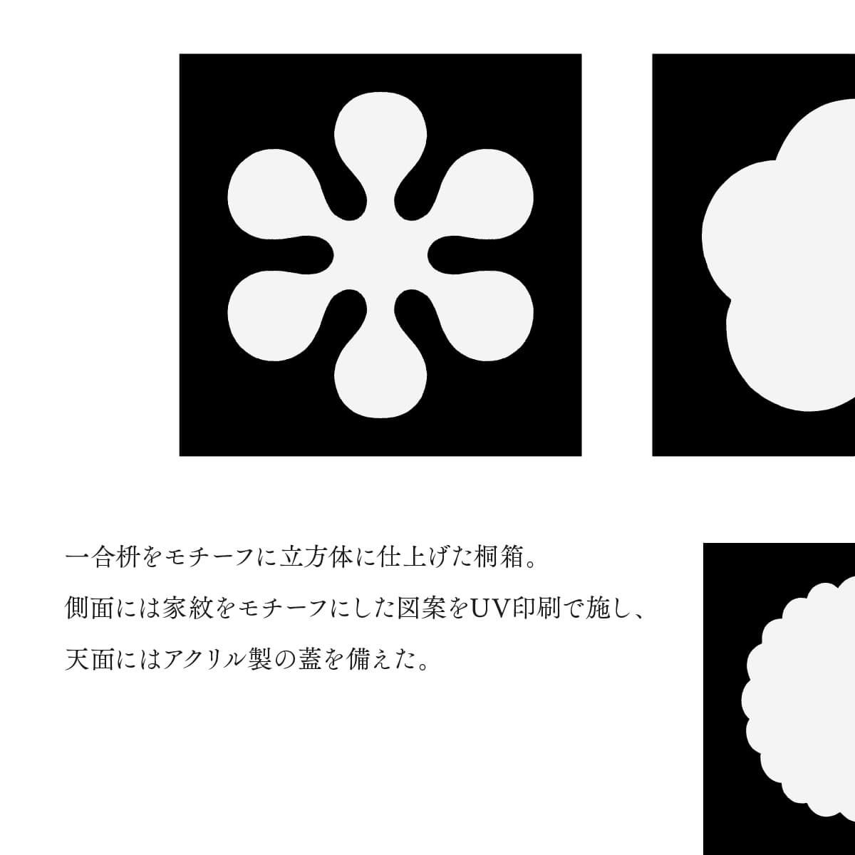 一合枡をモチーフに桐箱を立方体に仕上げました。 4側面には家紋を文様化した図案をUV印刷で施し、 天面にはアクリル製の蓋を備えています。 測定器の役目から解放された桐箱を、今の暮らしに自由にお見立て下さい。 Design IKKI KOBAYASHI Production produce 箱義桐箱店