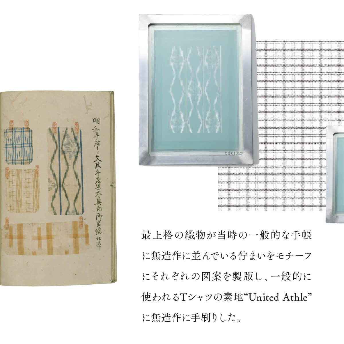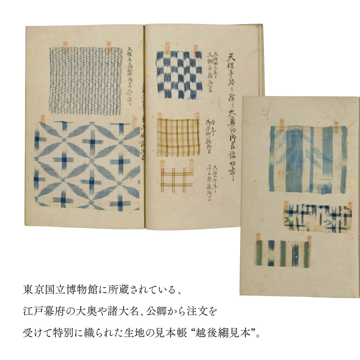 江戸幕府で使用されていた“生地の見本帖”をモチーフに、それぞれの図案を製版し、1点1点手刷りしました。 無造作に並べられた最上格の着物の図案を現代の日用品としてお気軽にお楽しみ下さい。 Collection 東京国立博物館 Inspired by 越後縐見本